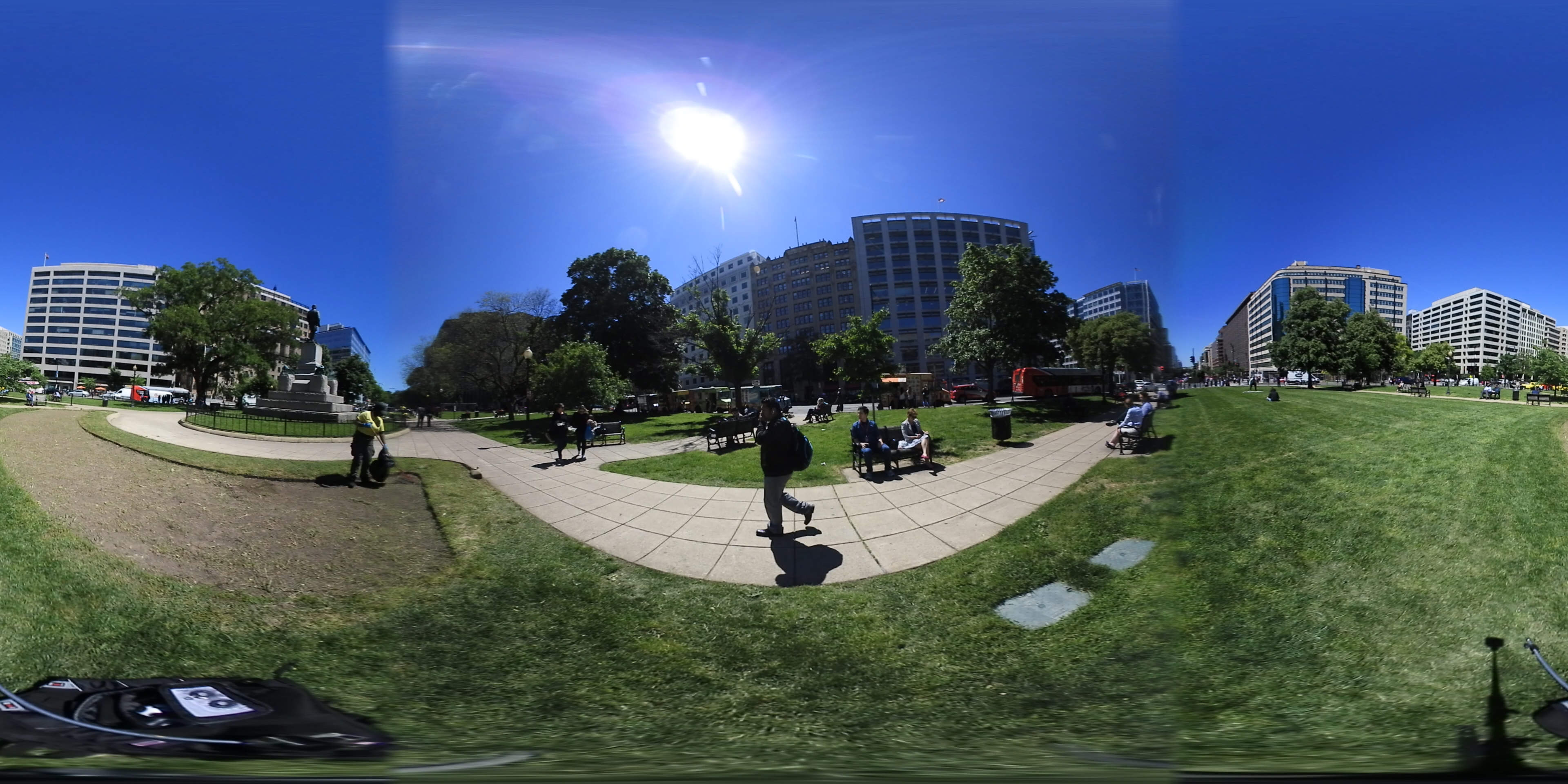 The GoPro rig offers the brightest, most balanced, and sharpest image, but its quality comes with a lot of extra work. Shot with 6 synchronized GoPro cameras, all six video images are stitched together using Kolor Autopano (which also allows for manual smoothing of stitch lines, balancing of light and color across the stitched panorama, and synchronization of video clips (which is why it's usually a good idea to provide a sound, usually a clap, for syncing when the cameras roll).