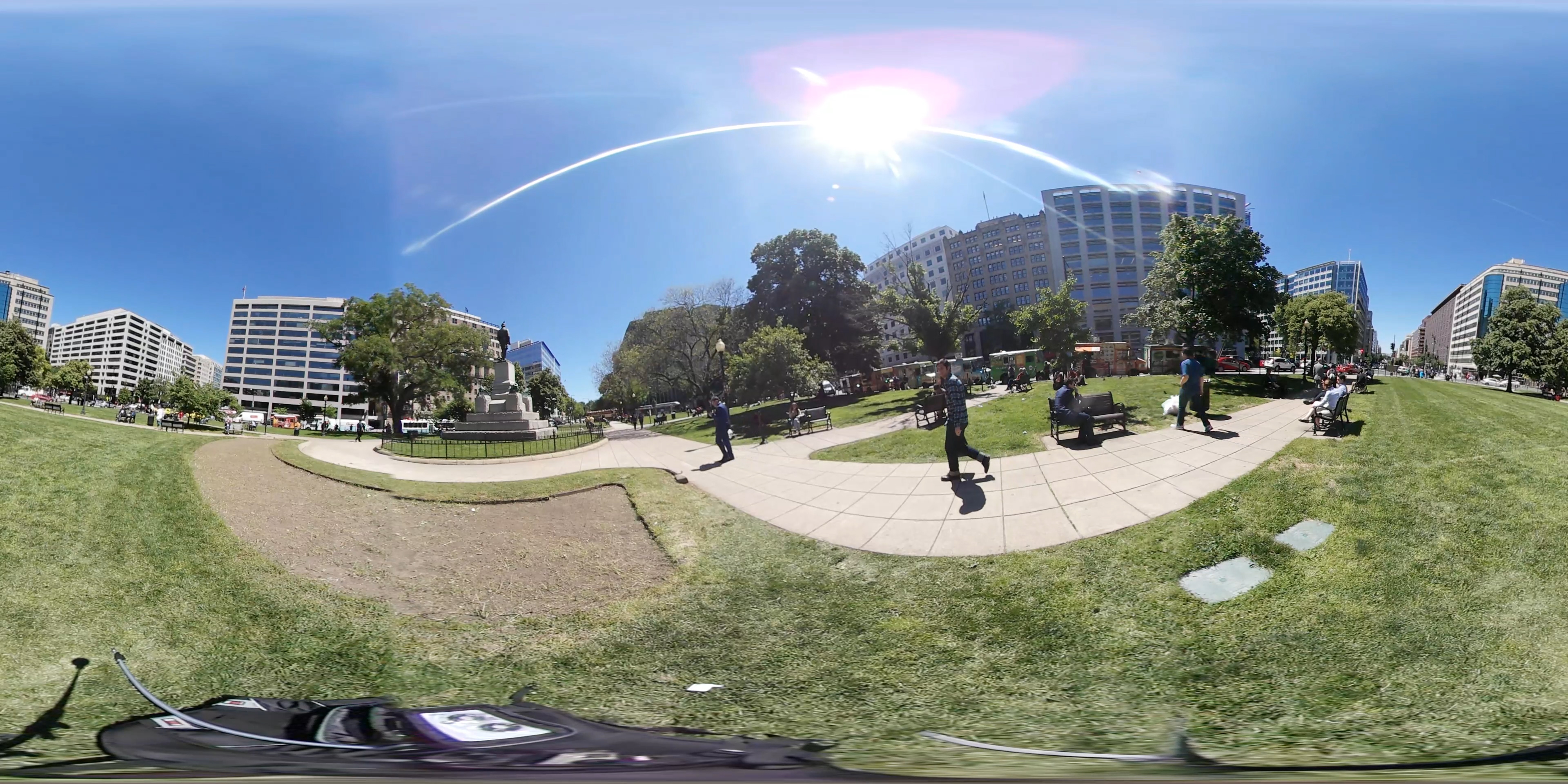The Gear 360 shoots at a higher resolution (3840 x 1920, 2.35:1), so the foreground textures stand out and moving objects are sharper. The downside here is the noticeable stitch line and the camera's vulnerability to glare (need to see if there's a good setting to prevent the colors getting washed out by the sunlight)