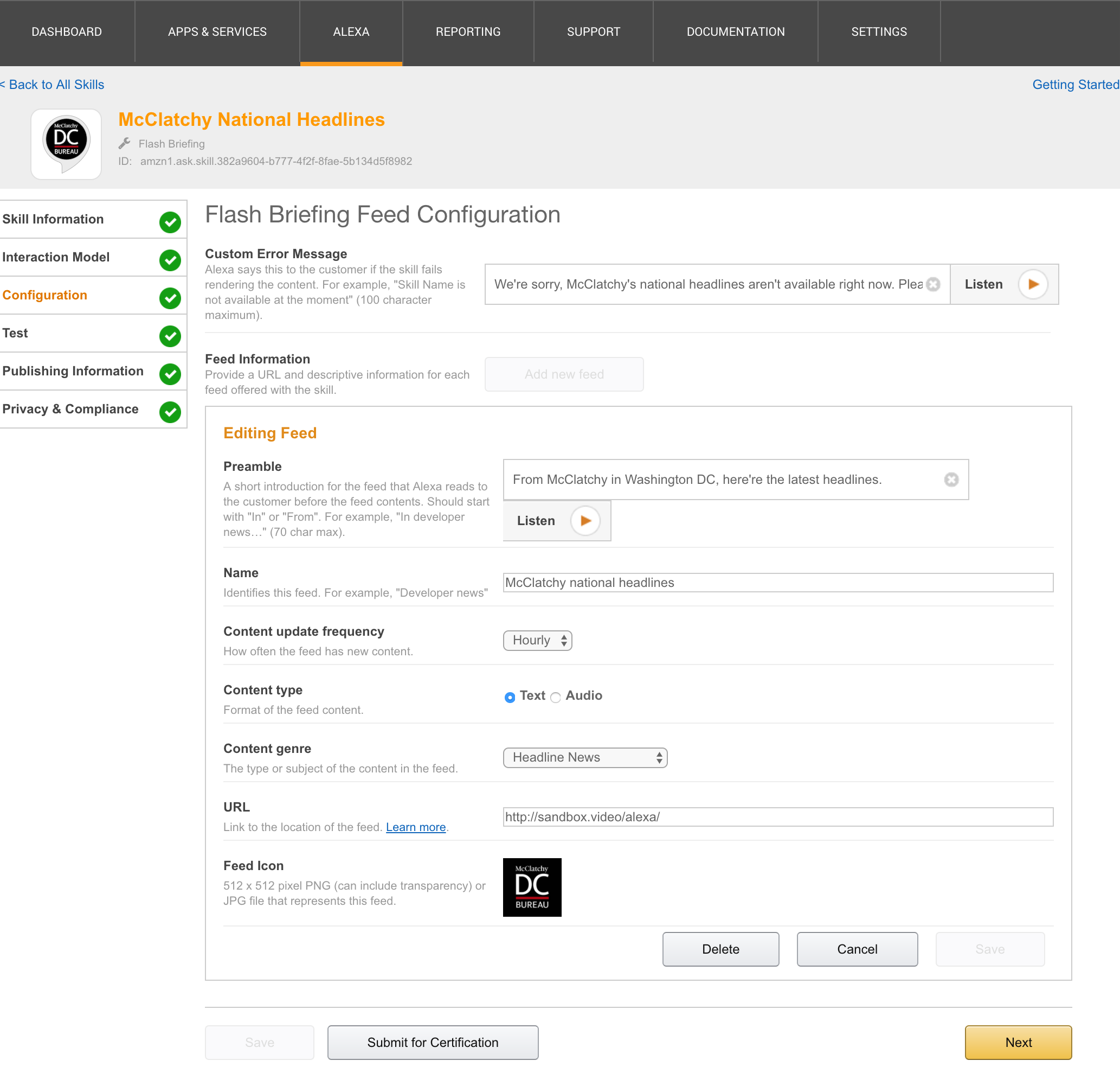 Then, in the Alexa dashboard we point the "news briefing" skill at the PHP file: