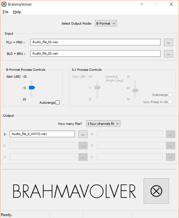 Output : Set “How many files?” to ‘1 four channels file’. This will populate the output window with a new audio file ending in _WXYZ.wav . Then hit the large button next to the “BRAHMAVOLVER” logo to begin the conversion. Brahma Volver will create a single 4-channel track, which we'll use for our ambisonic mix.