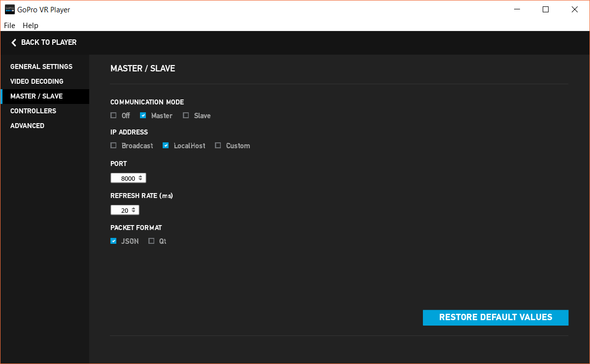 On the GoProVR Player's toolbar, choose "File" > "Preferences". From the list of options that come up on the left-hand side, pick "Master/Slave" and fill out the settings: