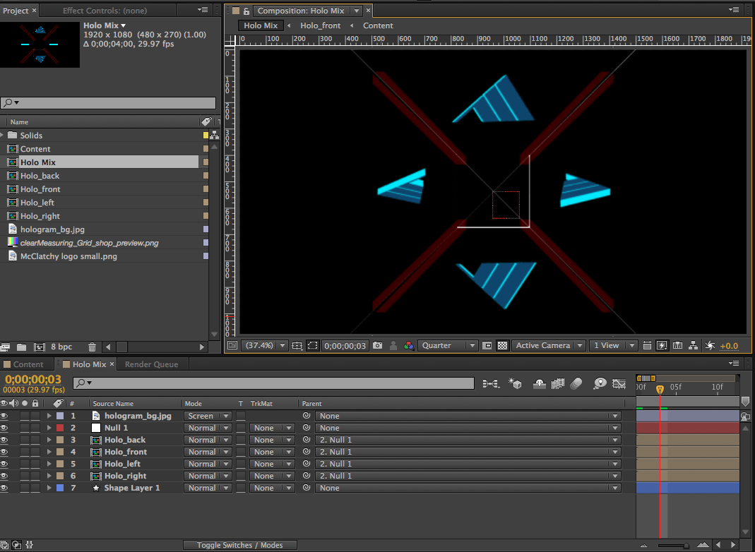 There is plenty of generic content available on YouTube, but I wanted to figure out how to create my own. I developed a template in After Effects that uses four cameras properly arranged around a single scene and composited together into a single video that is compatible with the pyramid.