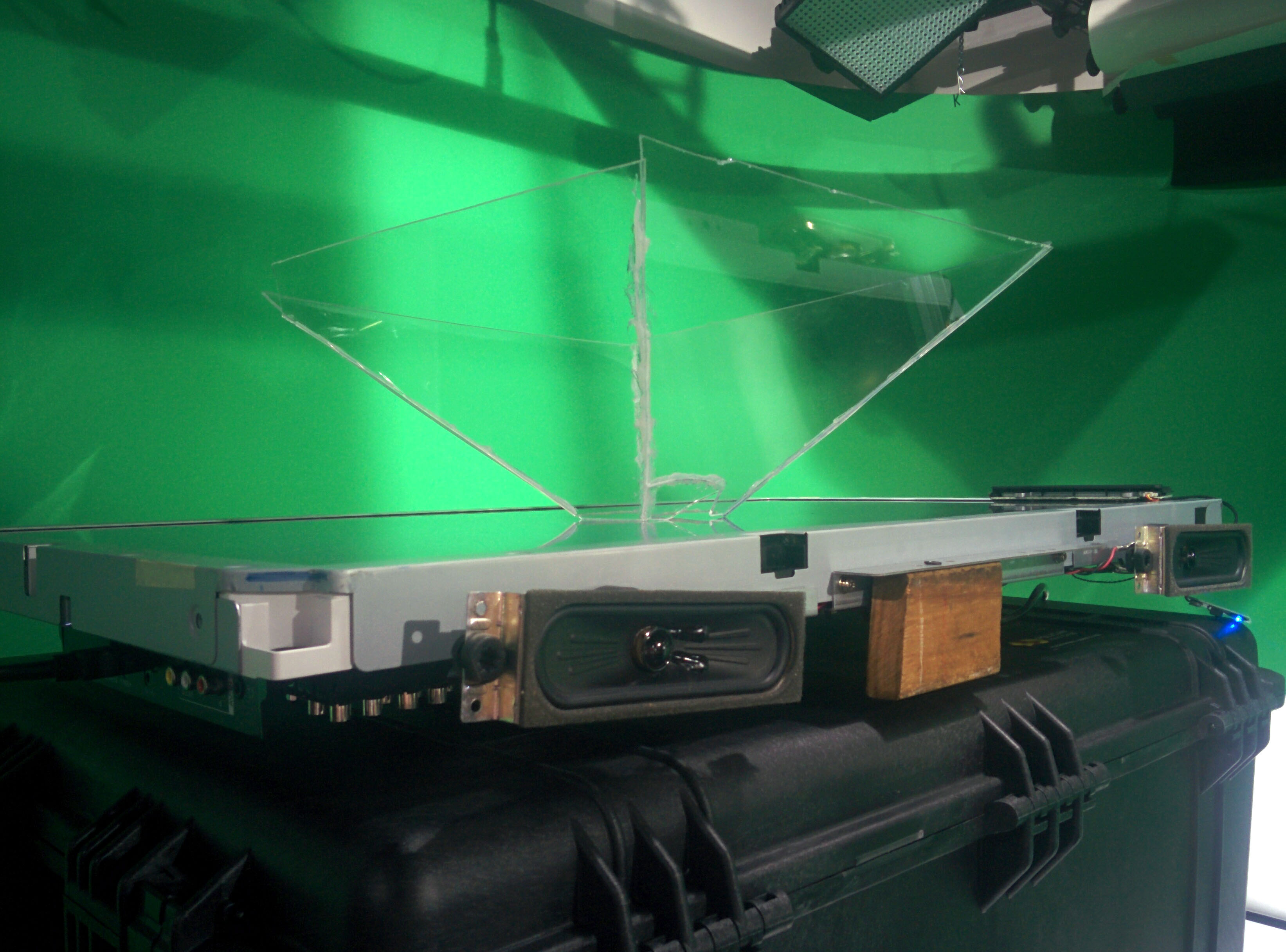 This experiment uses an illusion called Pepper's Ghost. It's an old concept, drawn from a 19th-century magic trick. The illusion uses a transparent and glossy surface (often glass) placed at an angle to the audience. The surface reflects an image (with a bright foreground and a dark background) making it appear to float in front of the audience.