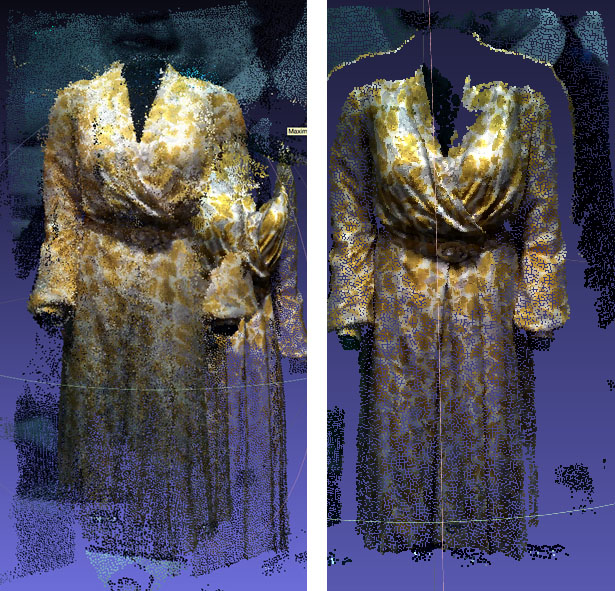 The two scans illustrate a problem with the MatterPort Scenes. In the image on the left, I tried to move around the dress and spatial drifting occurred. The phone lost its place and so it started to re-record the same points in different places. It's very pronounced in this image which was recorded through a reflective surface, but even when scanning plain opaque surfaces, there is a loss of clarity if you do multiple passes. The image on the right, by contrast, was produced with the phone sweeping over the dress only once, from a single perspective. The result is a 3D image with less noise and increased clarity. However the depth is limited. The recorded image is essentially a shell.