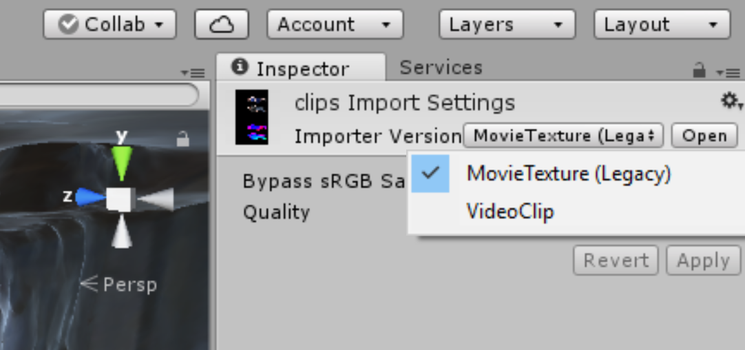 6. Added the three assets from step 4 into the DepthKit Prefab with the player set to 'Movie Texture' (had to set the .mp4 file's Import Settings to 'Movie Texture (Legacy)' to make sure it would be recognized in Unity).