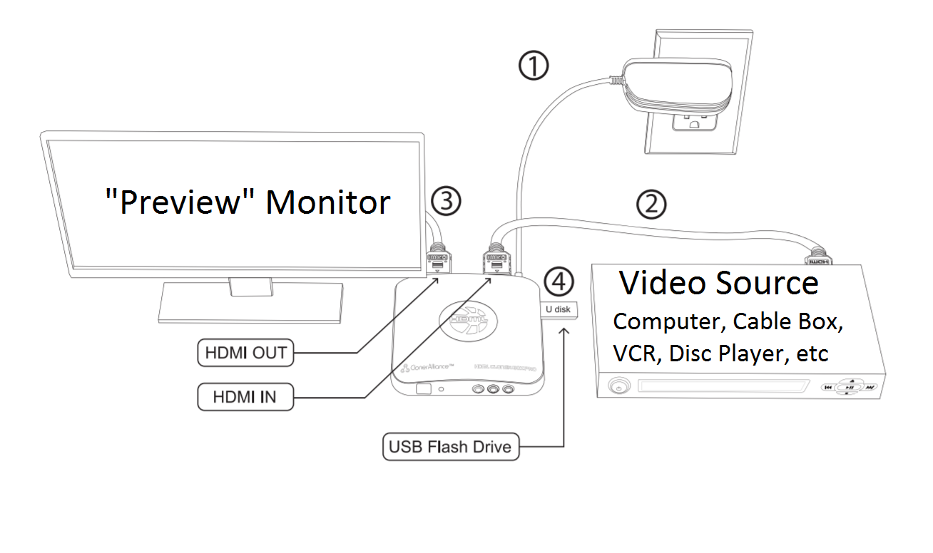 All you need to do is plug it in, connect it to your computer, using the HDMI “In” port (see below), and connect a thumb drive to the HDML box using the USB port (this will store the video files you record. A 16GB USB drive comes with the kit).